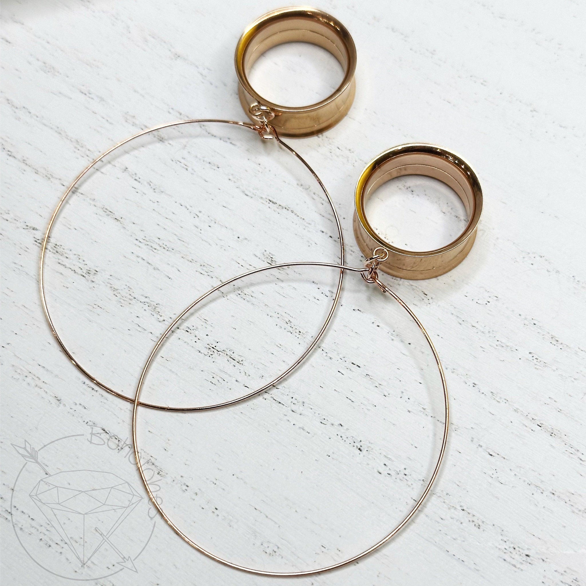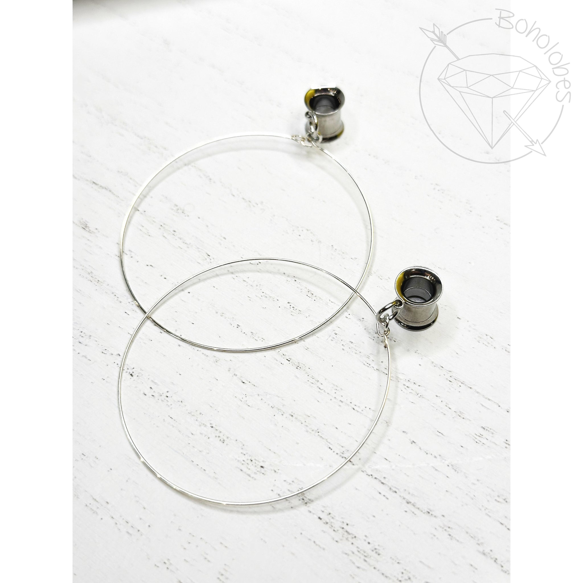 Pair of fine wire hoop dangle hollow plugs. 22g memory wire so you don't have to worry about them losing their shape.