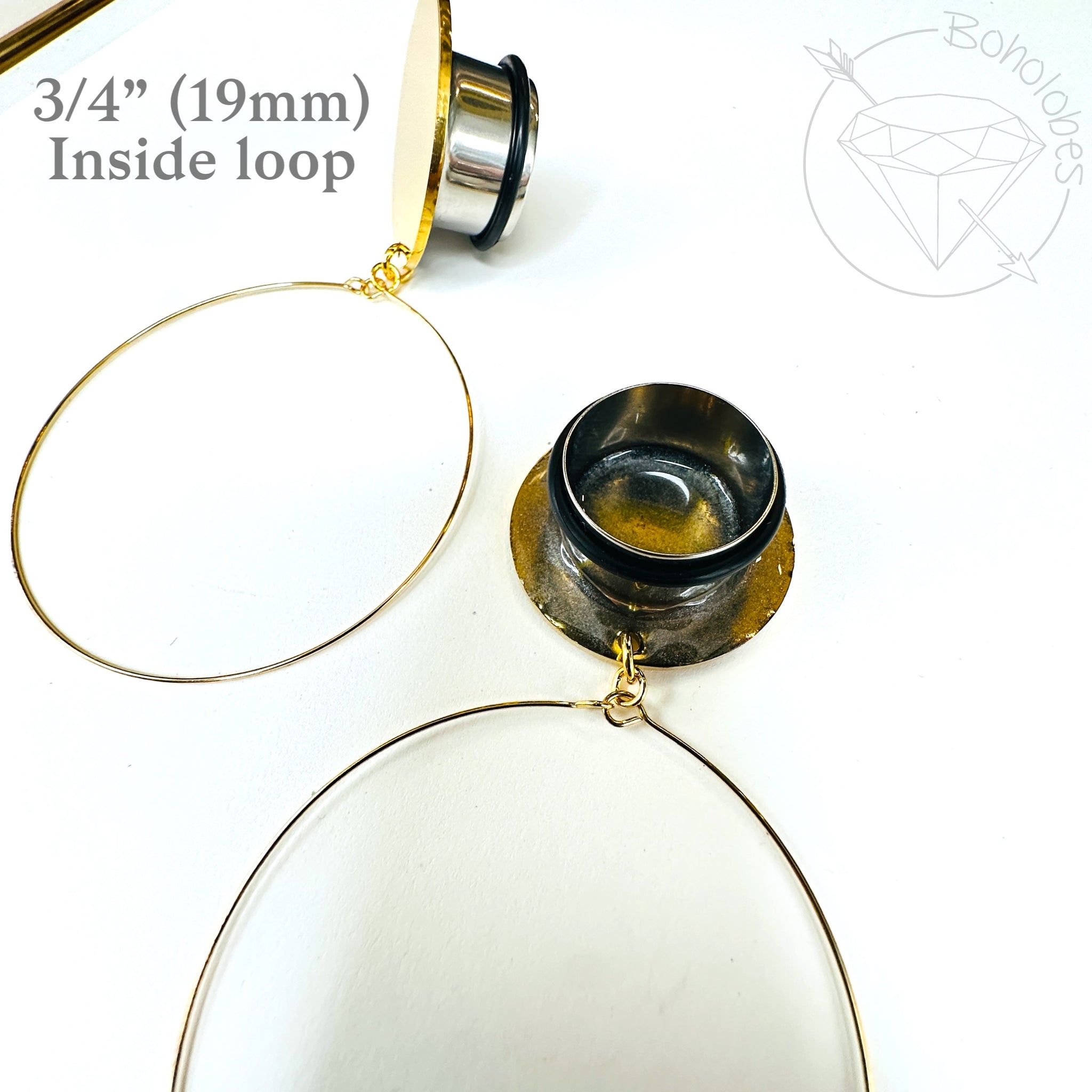 Pair of hoop dangle plugs. Gold toned blank (depending on size ordered) secured to single-flare 316L surgical stainless steel plugs. Embellishment style may vary depending on size ordered, for example the embellishment might have hoop on inside of embellishment or attached on the out outside like pictured.