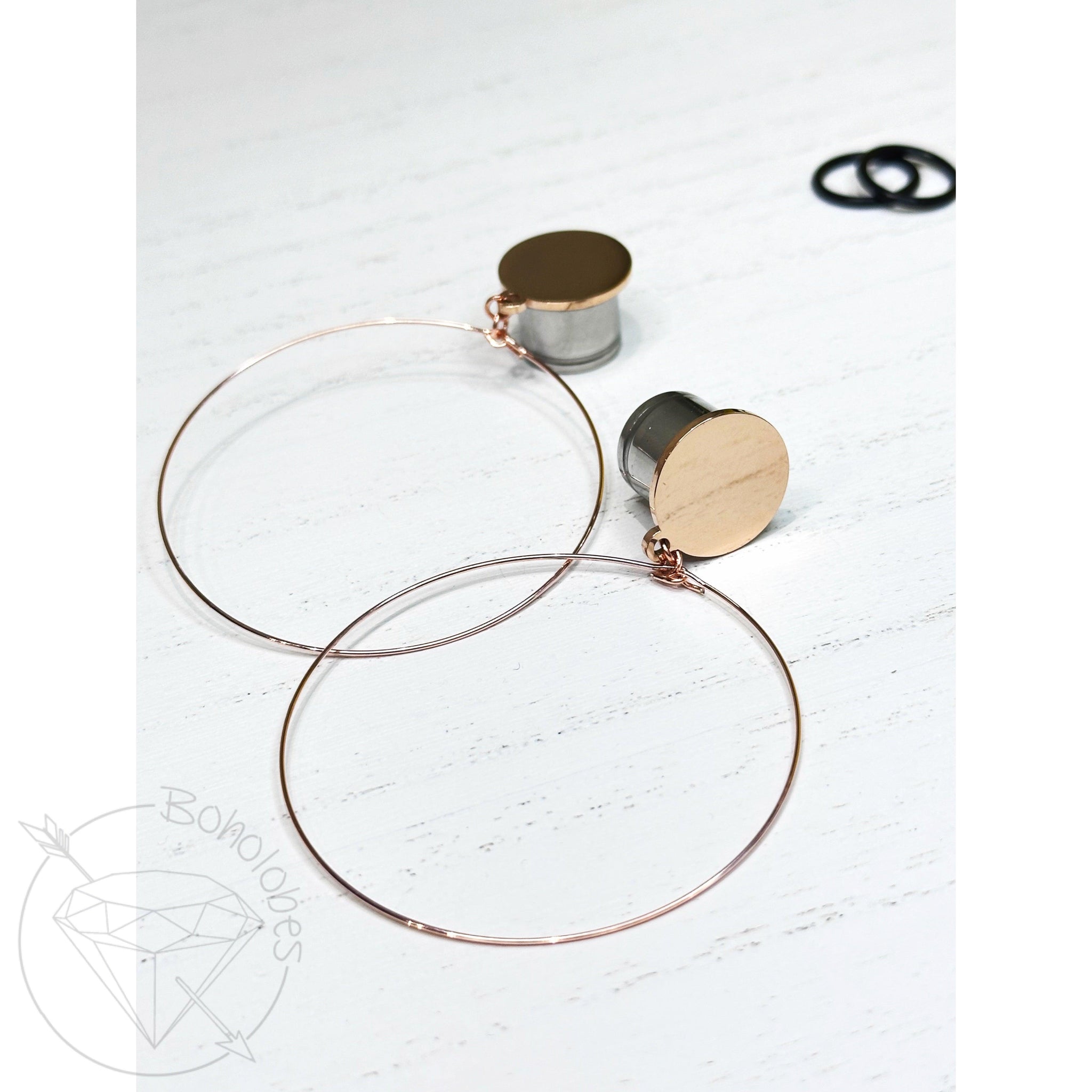 Pair of hoop dangle plugs. Gold or Silver toned blank (depending on size ordered) secured to single-flare 316L surgical stainless steel plugs. Embellishment style may vary depending on size ordered, for example the embellishment might have hoop on inside of embellishment or attached on the out outside like pictured.