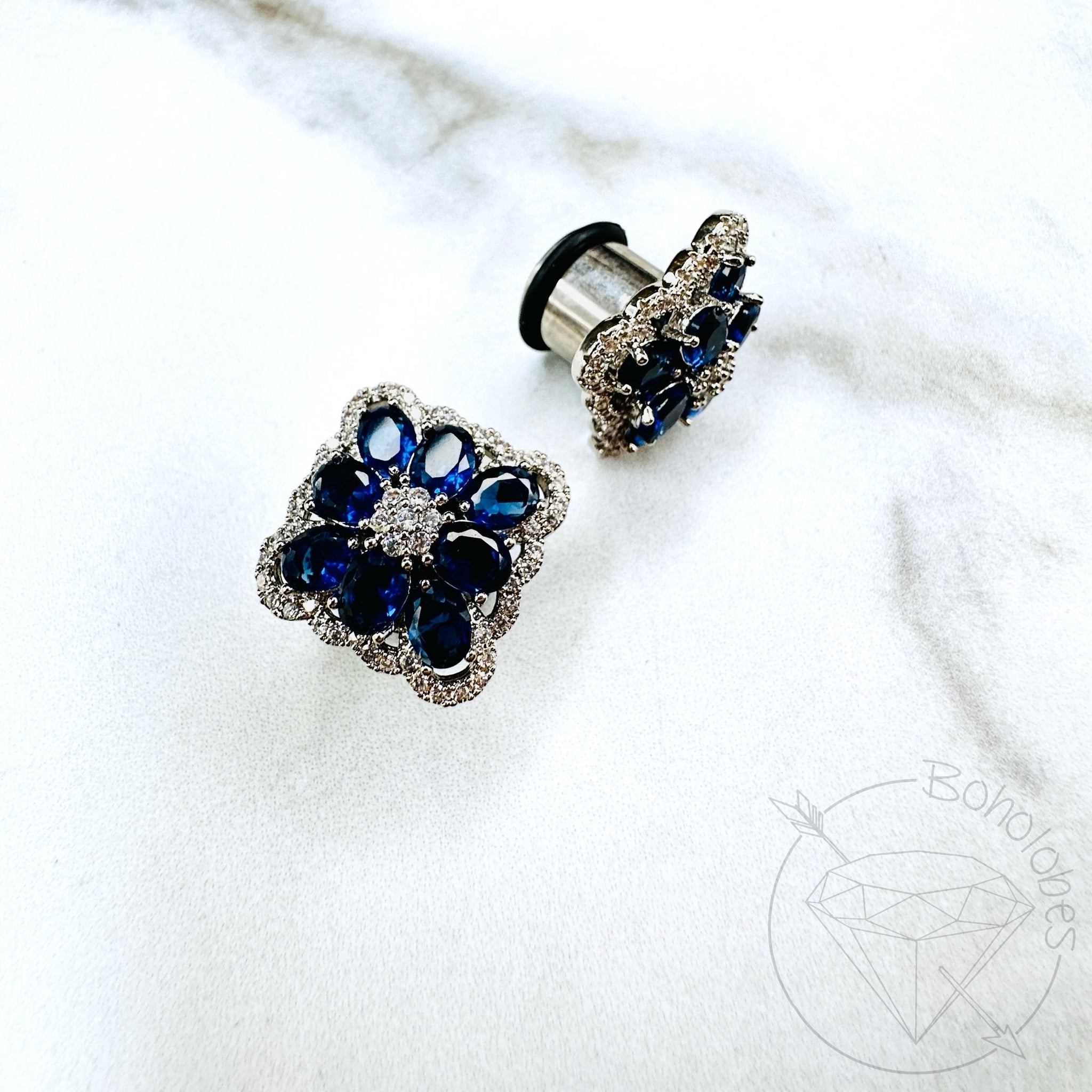 Pair of antique brooch style rhinestone burst single-flare 316L surgical stainless steel plugs. Clear and sapphire CZ crystals. Scalloped edge / flower center