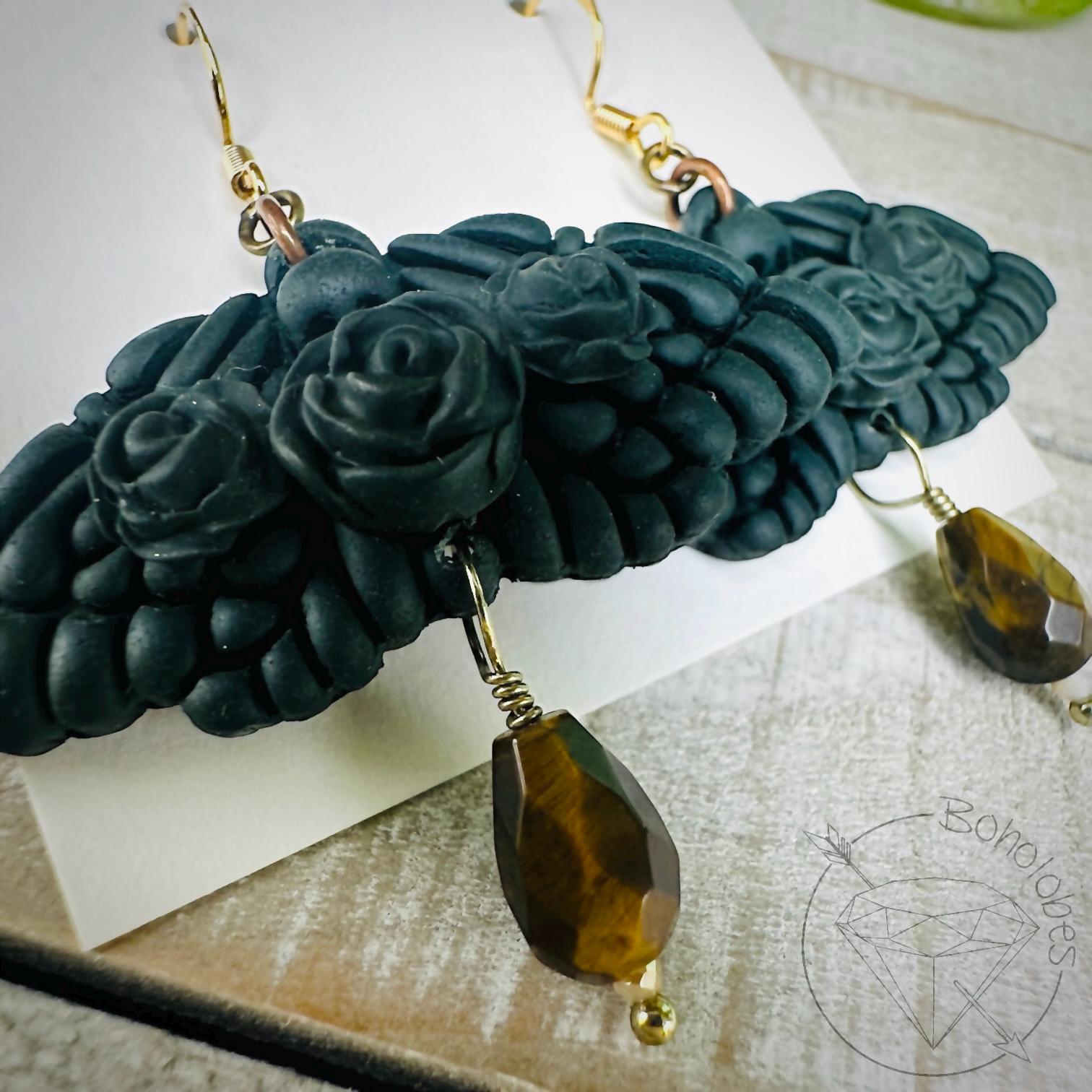 Pair of handmade dark green clay moth / faceted tiger eye teardrop bead / dangle hollow plugs.