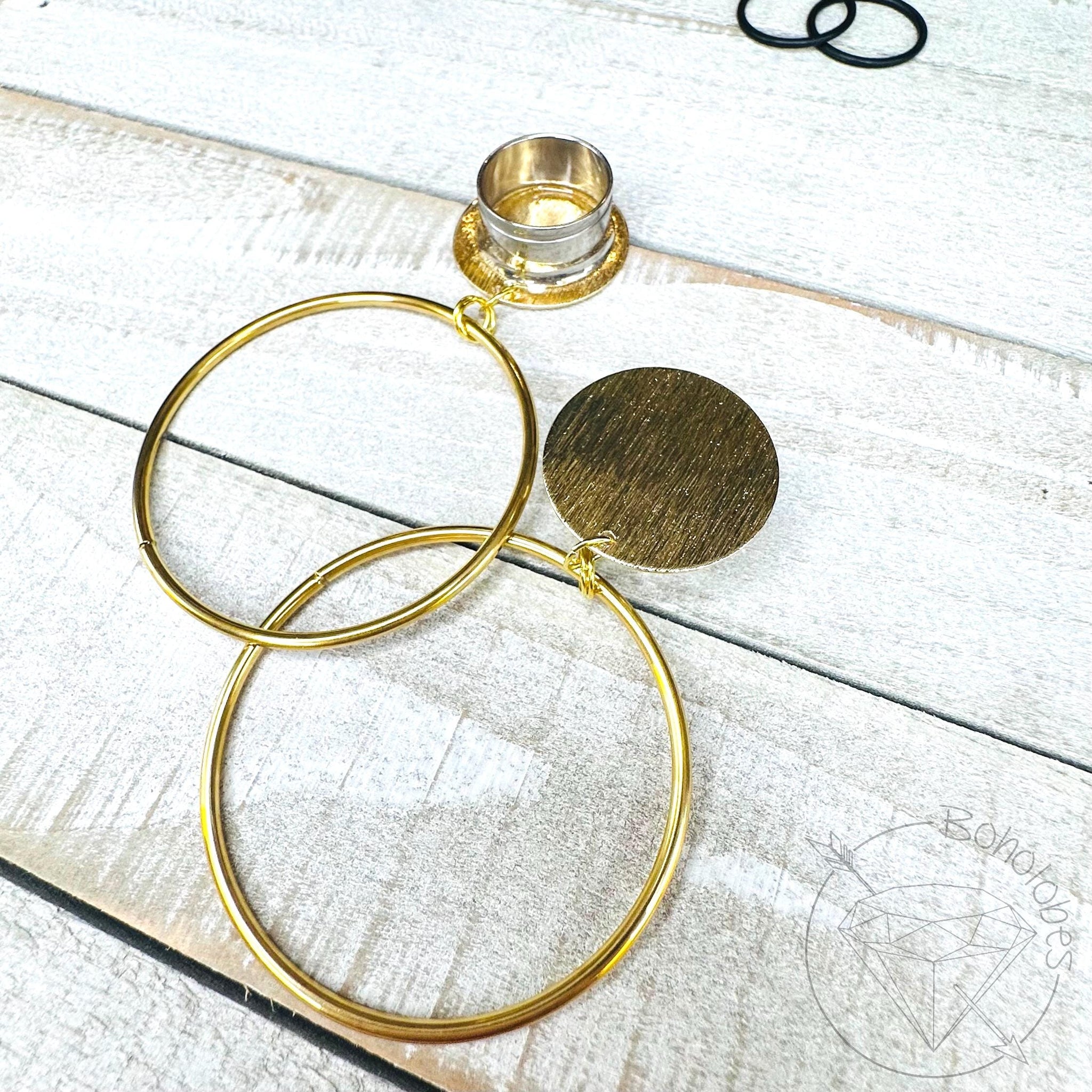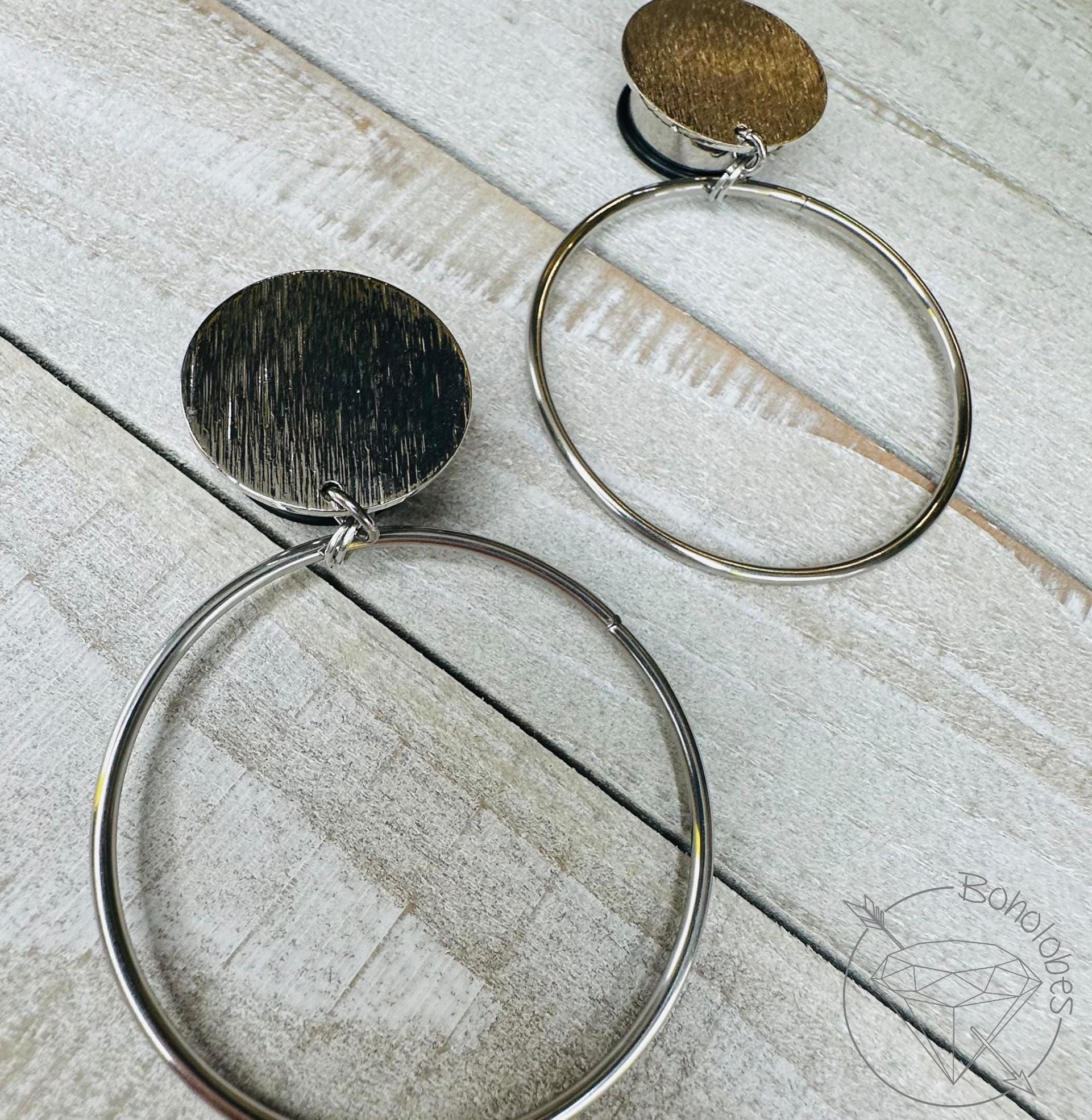 Make a bold statement with these hoop hider dangle plugs, designed to give the look of oversized hoops while keeping the comfort and security of single-flare plugs. Each pair is handcrafted and made to order using high-quality surgical steel components for durability and everyday wear.