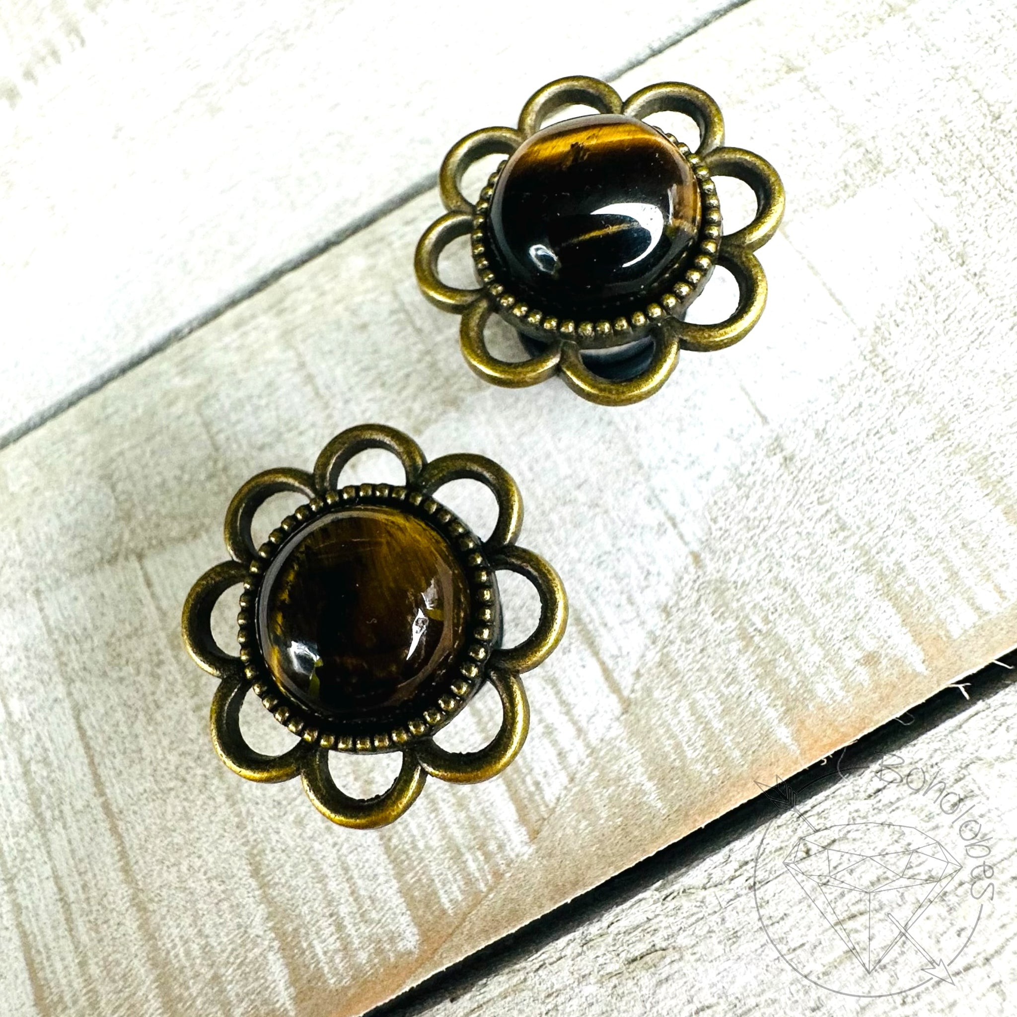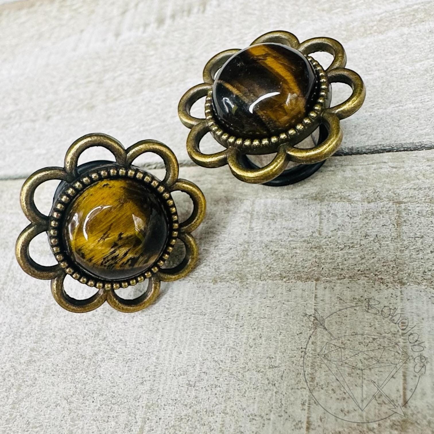 Pair of Tiger Eye natural stone daisy flower plugs/tunnels featuring a brass-tone cabochon setting (15mm or 22mm top). These are single-flare 316L surgical stainless steel plugs designed for stretched ears. Each flower has natural stone variation, making every pair beautifully unique.